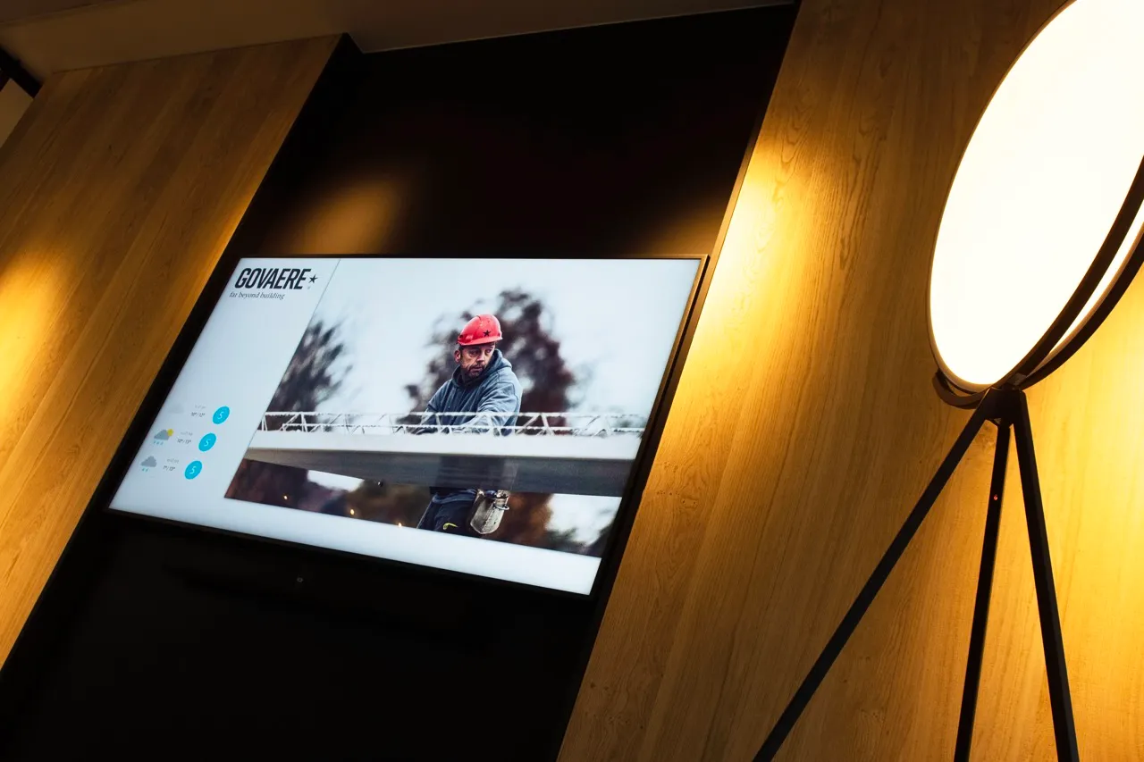 De AV-setup ondersteunt Govaere's professionele imago vanaf het moment dat bezoekers binnenkomen. De digitale receptie werkt efficiënt, de wachtruimte inspireert, en meetings verlopen vlotter dankzij eenvoudige presentatietechnologie.
