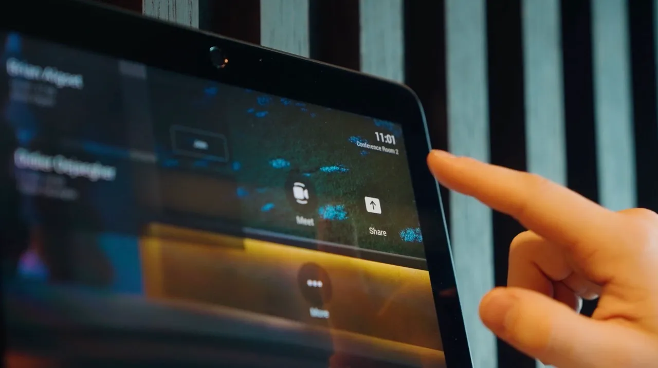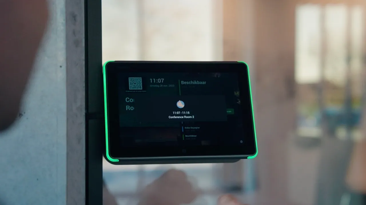 Om de dagelijkse werking verder te ondersteunen, werd elke vergaderzaal voorzien van een duidelijke beschikbaarheidsweergave. Zo is in één oogopslag zichtbaar welke ruimte vrij of bezet is.