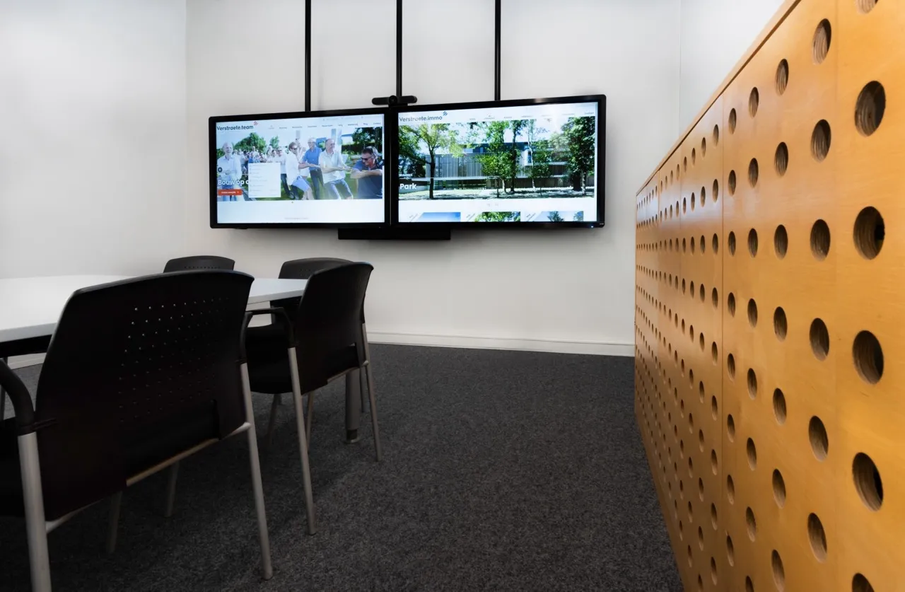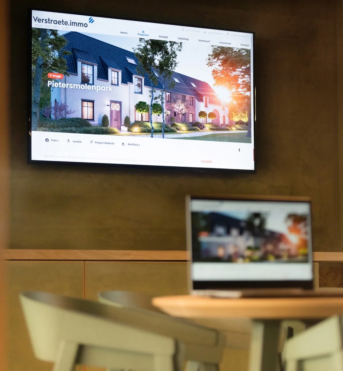 Tot slot kreeg de inkomhal een digital signage oplossing. Twee grote schermen tonen projectrealisaties, bedrijfscommunicatie en dagelijkse updates, beheerd vanuit één centrale locatie.